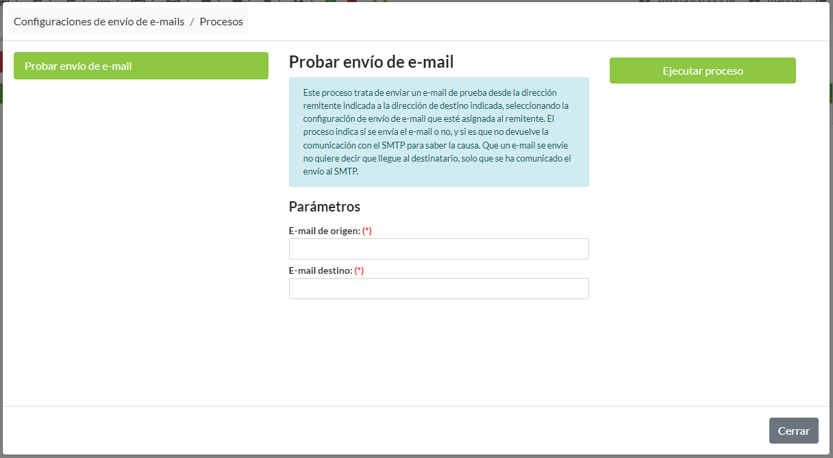 Para poder comprobar que el envío de correos electrónicos se realiza correctamente, el sistema cuenta con este proceso específico para probar el envío de correos desde una dirección remitente a una dirección de destino indicadas, seleccionando la configuración de envío de e-mail que esté asignada al remitente.