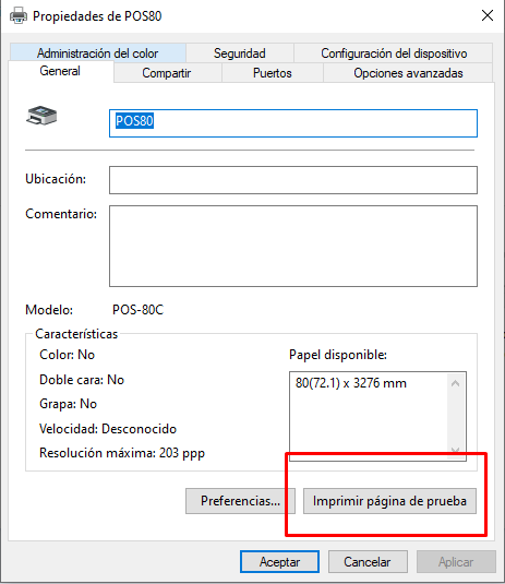 Lo primero que se comprobará es si la impresora funciona desde el propio driver. En Windows, iremos a Panel de control -> Ver dispositivos e impresoras. Aquí, haremos click derecho sobre la impresora de tickets y pulsaremos en Propiedades de impresora. Una vez hecho esto, pulsaremos el botón Imprimir página de prueba.