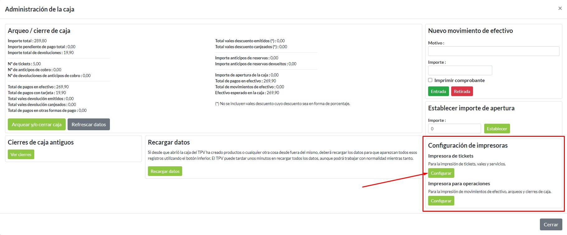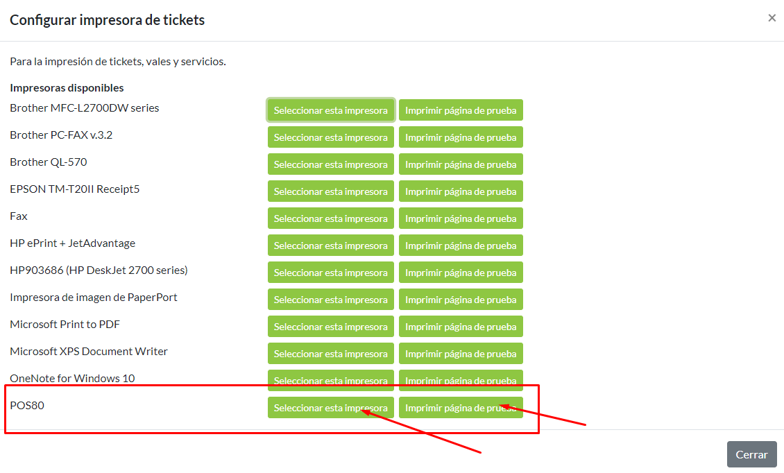 Si la impresora ha conseguido imprimir desde aquí, entonces puede que el problema esté en su vinculación con el TPV de Ilastec. Lo primero que haremos será asegurarnos de que estamos usando la versión de escritorio del TPV, y no la de navegador. Desde el TPV de escritorio pulsaremos el botón Caja y, en el apartado Configuración de impresoras, pulsaremos en Configurar en la parte de Impresoras de tickets. Aquí se seleccionará la impresora de tickets y podremos imprimir una página de prueba. Si todo va bien, habrá quedado solucionado.