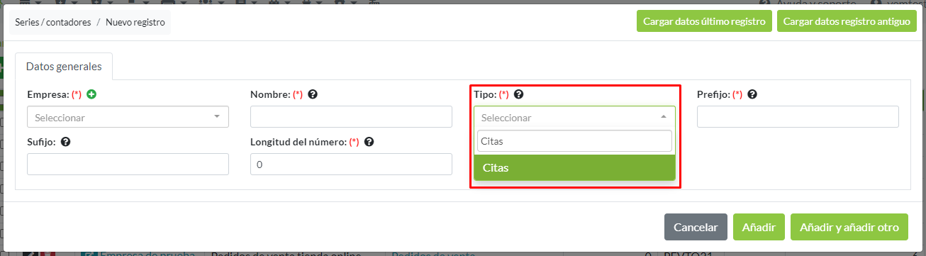 - Serie: Campo obligatorio para indicar la serie en la que se registra la cita. Por defecto se establece a la serie configurada como predeterminada en los parámetros de la empresa.