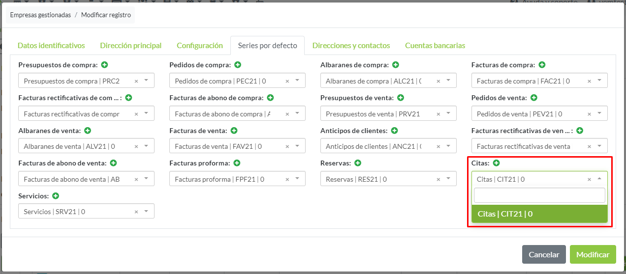 Accediendo a la configuración de la empresa entrando desde el panel principal a Parámetros -> Empresas -> Empresas gestionadas, pueden editarse las series por defecto para las citas que se creen en cada una de ellas. De esta manera se puede tener un contador distinto cargado por defecto para cada empresa.