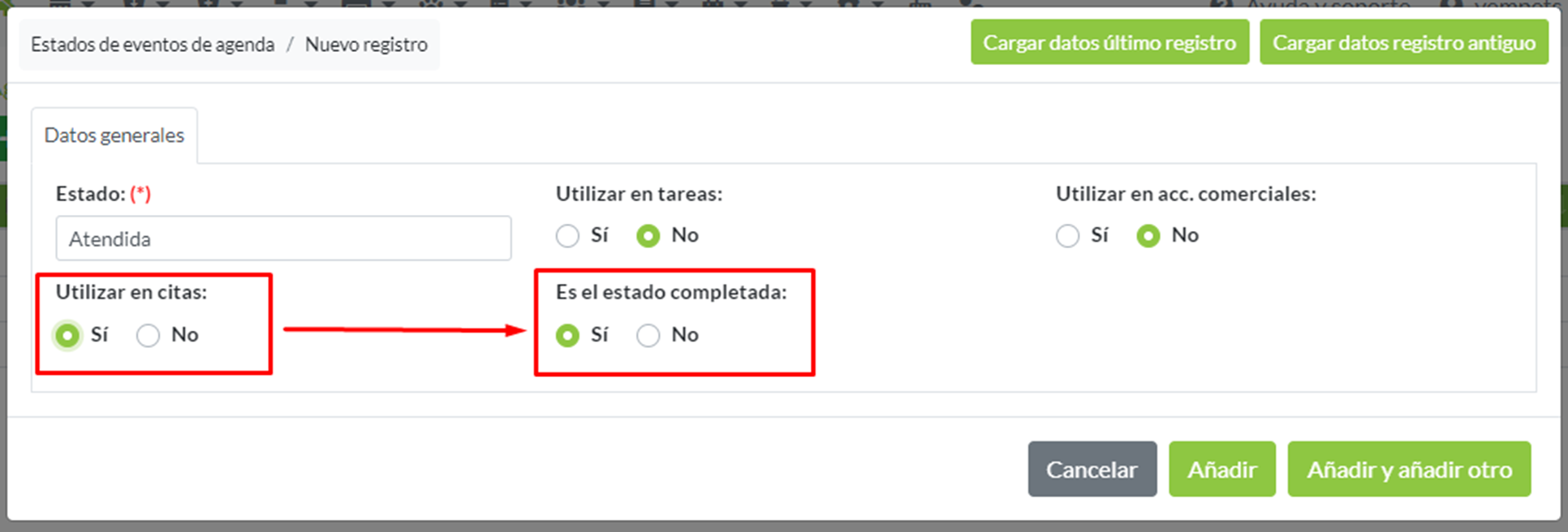 Además, se puede indicar si el nuevo estado da por finalizada la cita y no requerirá más acciones para su seguimiento, marcando a Sí el campo Es el estado completada.