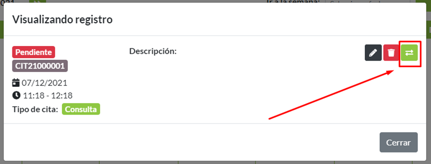 Para ejecutar este proceso desde el calendario se debe acceder al detalle del registro y pulsar sobre el botón de Cambio de estado.