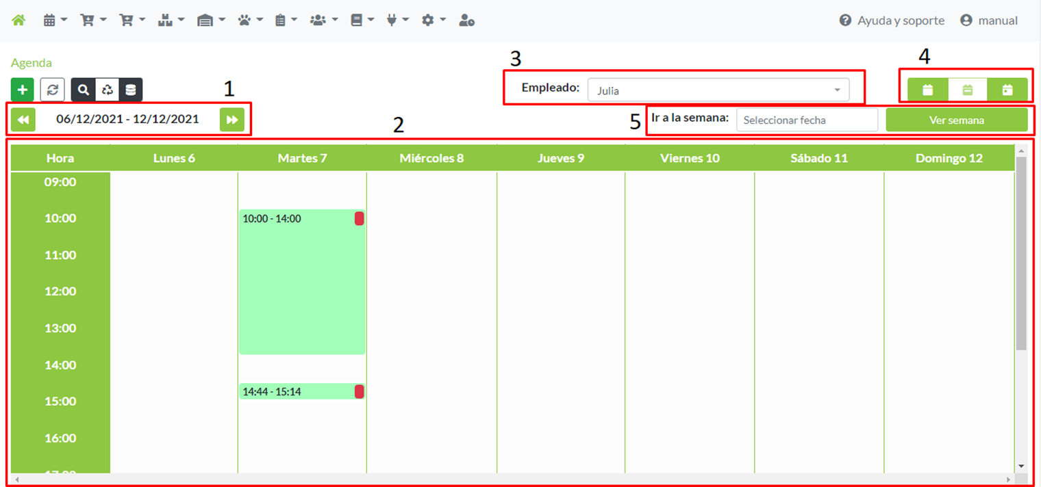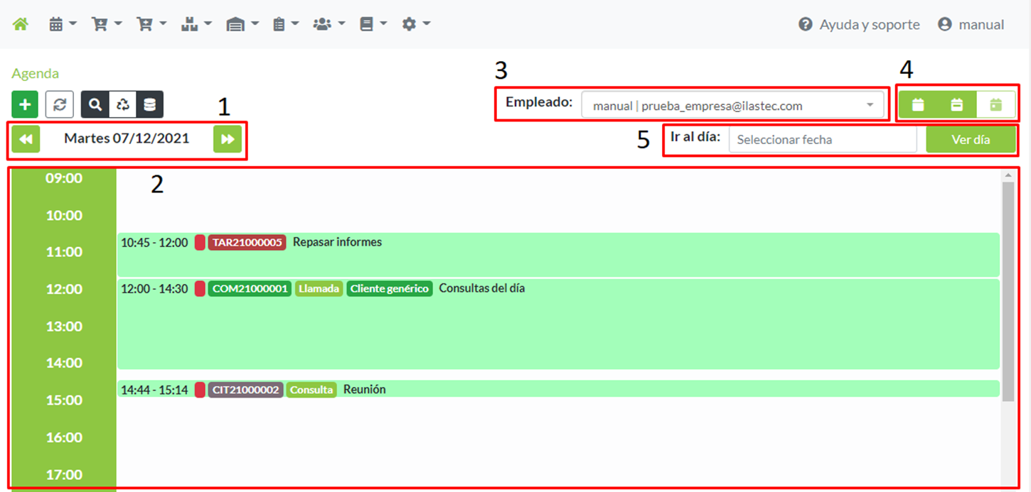 - Día actual que se visualiza. Por defecto carga la agenda con la fecha actual.