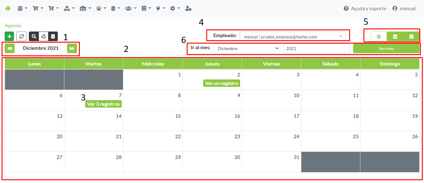 - Calendario del mes con detalle de registros totales por día. Al pulsar sobre un día, la vista carga con la agenda de ese día.