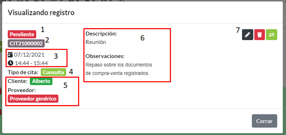 Una vez creado el registro, se podrá visualizar en el calendario de citas y será visible en el módulo de Agenda.