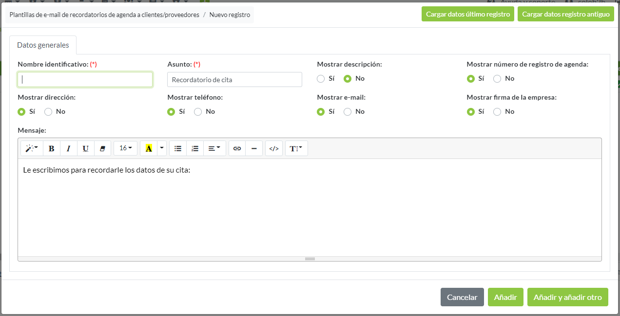 - Plantilla de recordatorio: Campo para seleccionar una plantilla de recordatorio para el envío de emails, donde se establece el contenido del correo.