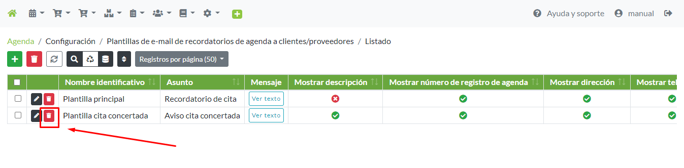 Para eliminar un registro de plantilla, se debe pulsar sobre el botón rojo con la papelera del registro.
