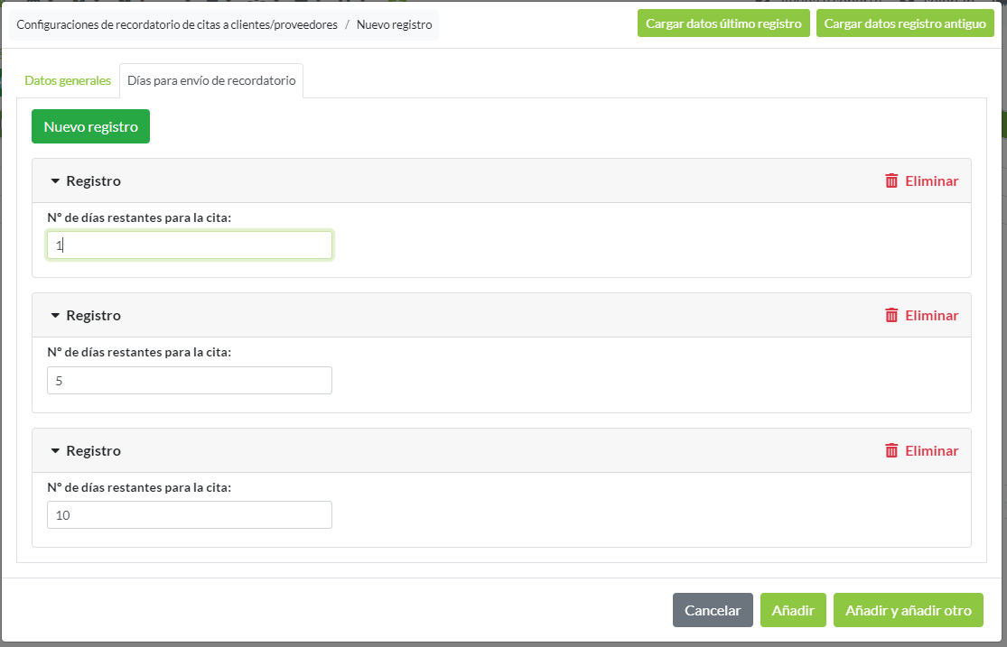 Es decir que, si se desea enviar tres recordatorios, uno 10 días antes de la cita, otro recordatorio 5 días antes y el último, el día antes a la cita, se deben crear 3 registros indicando en cada uno esos números de días.