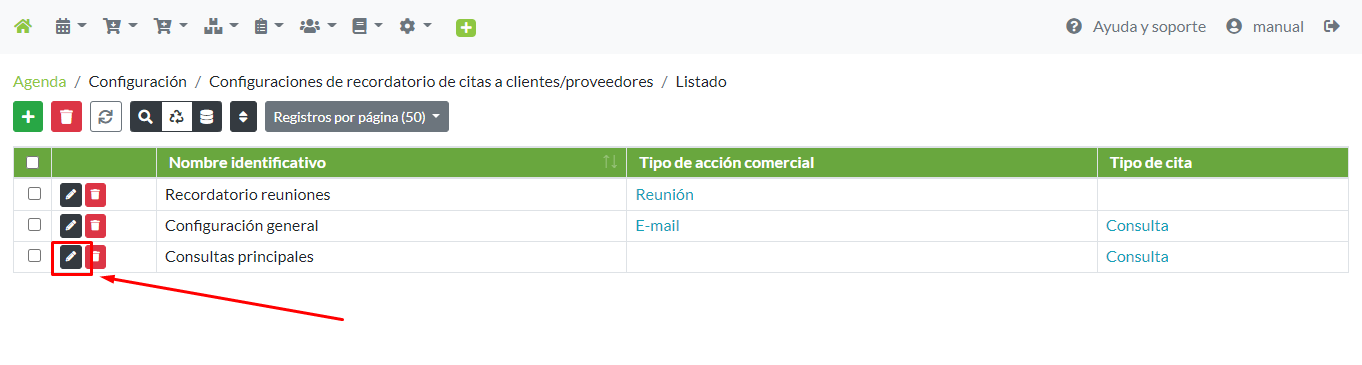 Para editar una configuración de recordatorio, se debe pulsar el botón negro con el lápiz en las opciones del registro que se quiera modificar.