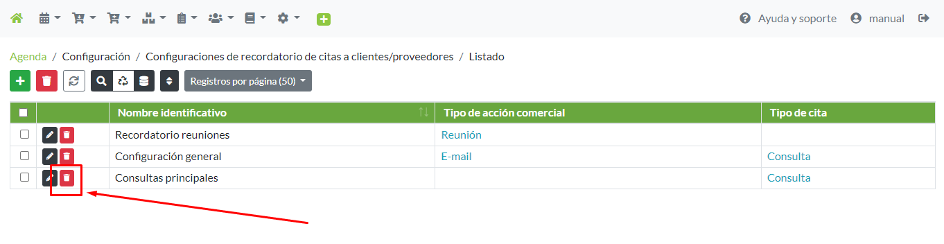 En el caso de querer eliminar una configuración, se debe pulsar sobre el botón rojo con la papelera en las opciones del registro.