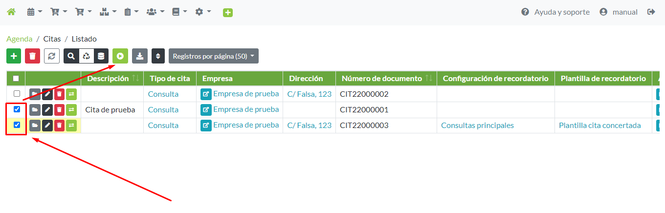 Y para borrar registros de forma masiva, se deben seleccionar en el listado y pulsar sobre el botón rojo con la papelera del menú superior.