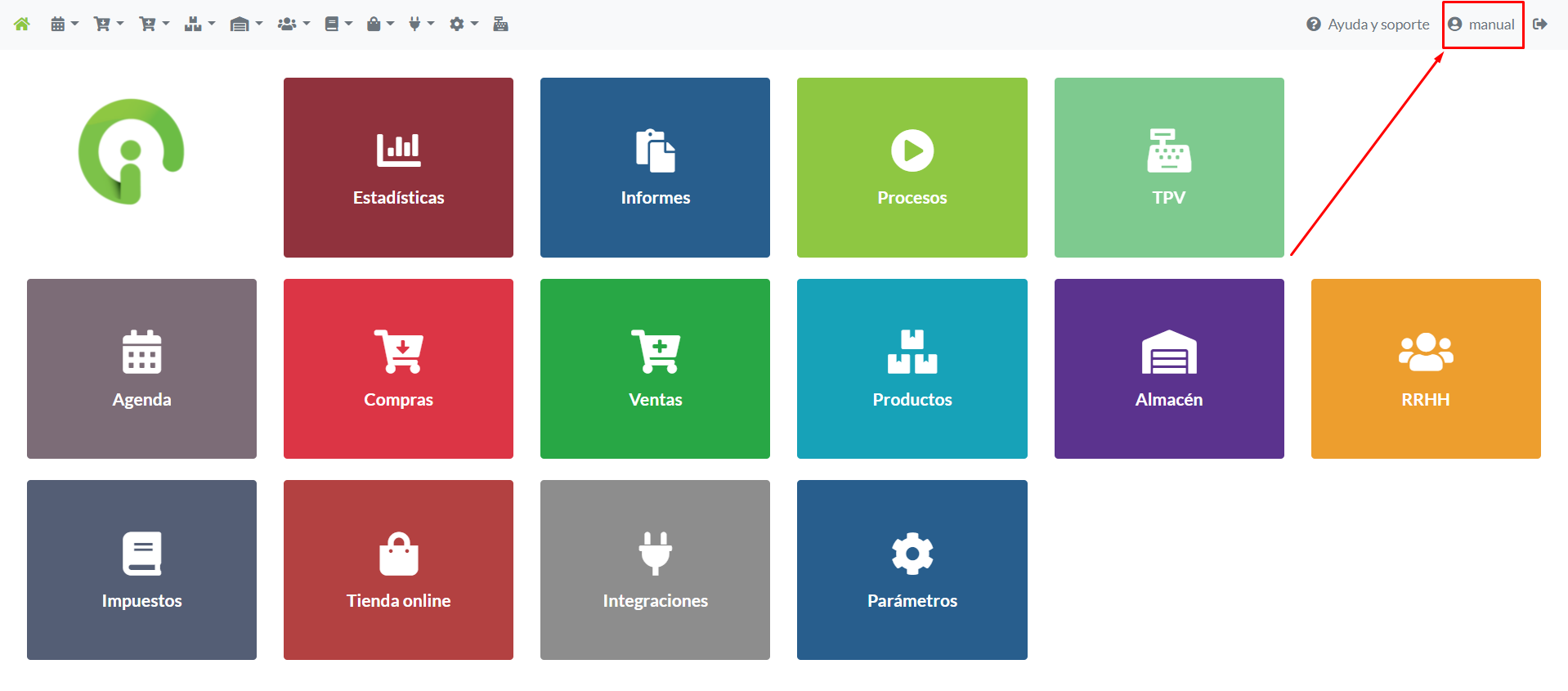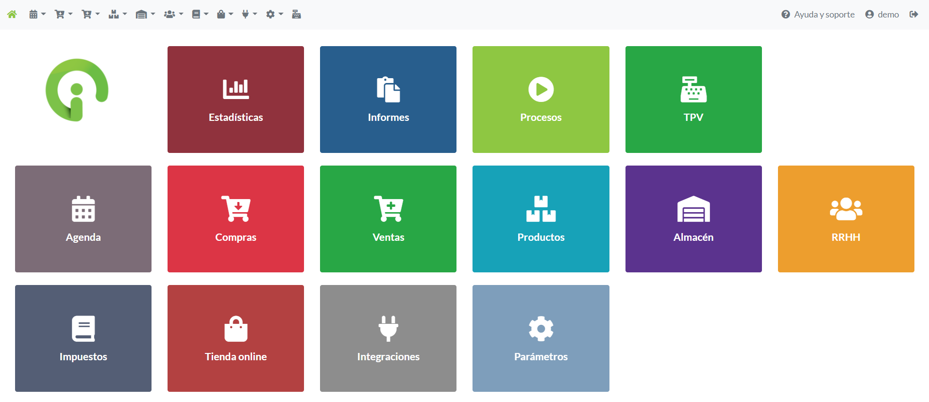 A continuación de estos, se muestran los módulos específicos del tipo de programa que se esté utilizando. Los módulos de Compras, Ventas, Productos, Almacén, Tienda online... permanecen en el mismo lugar. A estos se les añade el módulo de Agenda, donde se podrá llevar un control total de citas, tareas o acciones comerciales (dependiendo del programa usado) y un módulo de Impuestos, donde se recogen los impuestos de las compras y ventas declaradas en el sistema.