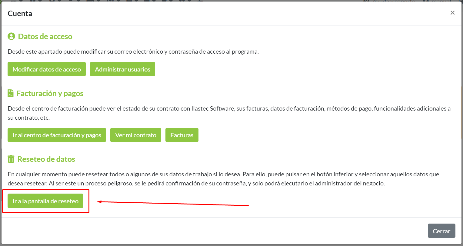 Y dentro del panel de usuario, en el apartado Reseteo de datos, pulsando sobre el botón Ir a la pantalla de reseteo.