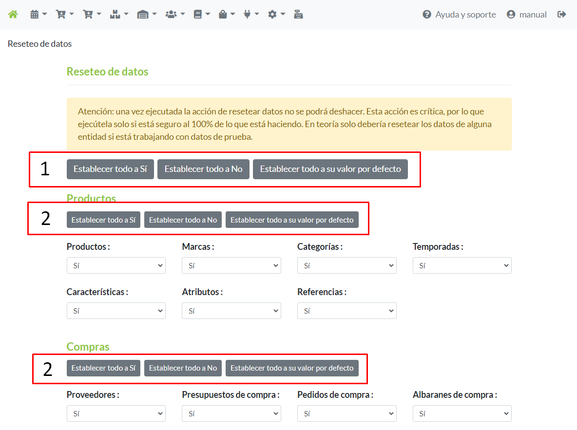 Esta pantalla es un formulario donde se debe seleccionar a Sí cada apartado que se quiera resetear, dejando a No aquel apartado donde se quiera mantener su información. Para agilizar la selección de los campos, esta pantalla incluye: