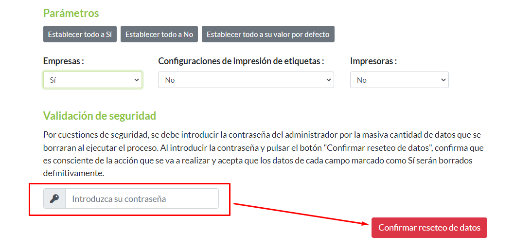 Como último paso, se debe realizar una validación por seguridad indicando la contraseña del administrador. Así asegura que es consciente de que la acción es irreversible y acepta que los datos de cada campo marcado como Sí serán borrados definitivamente.