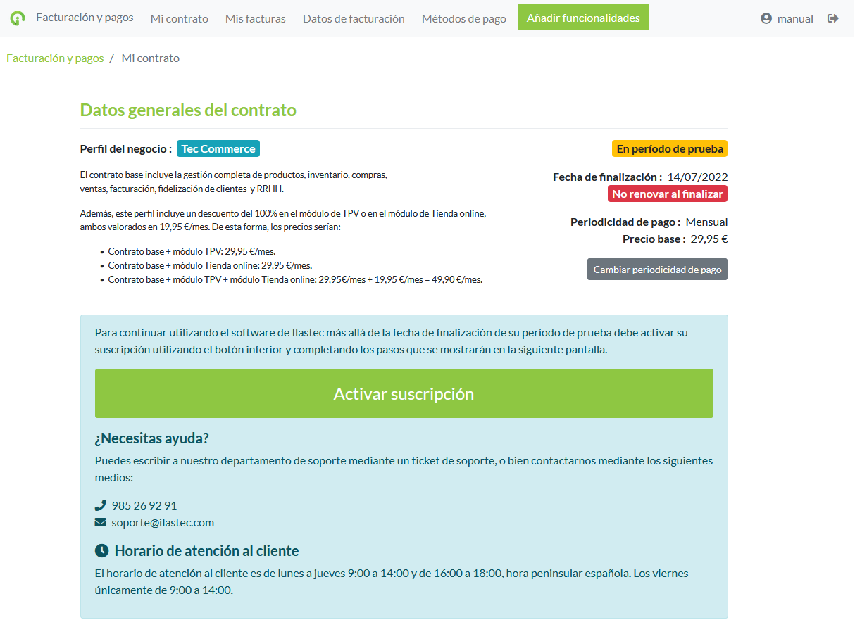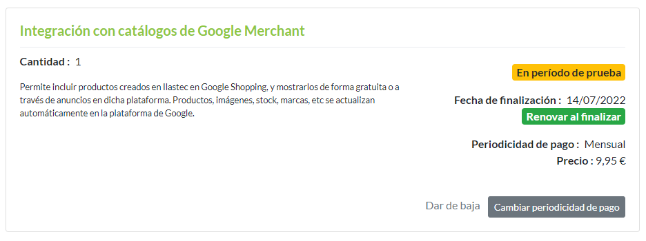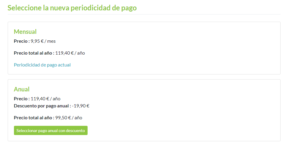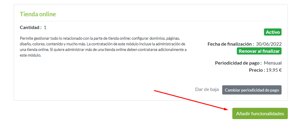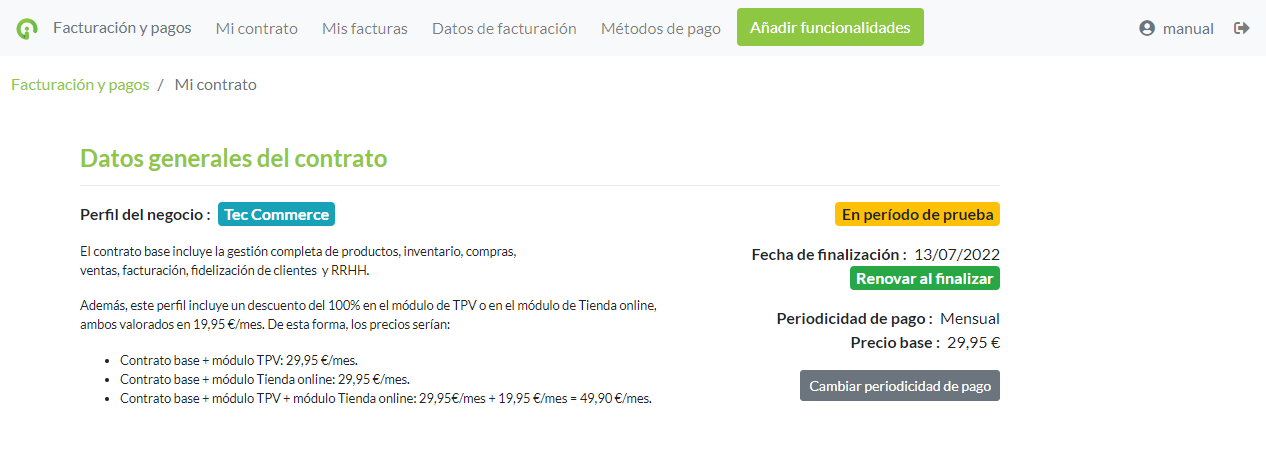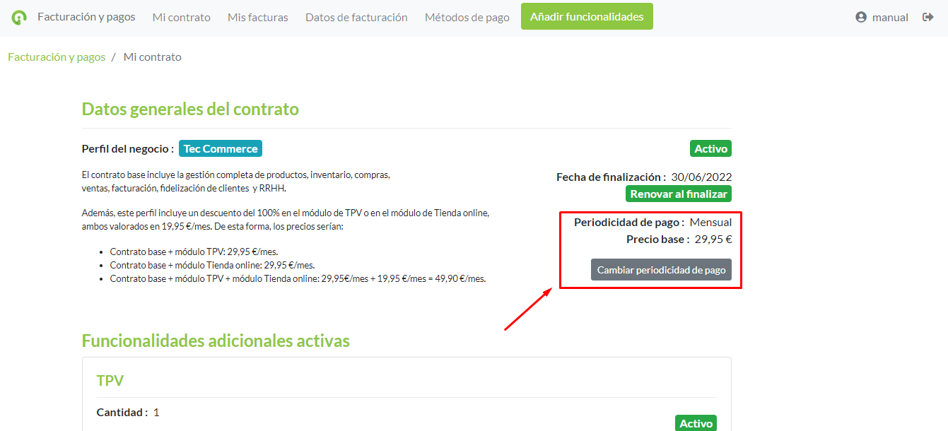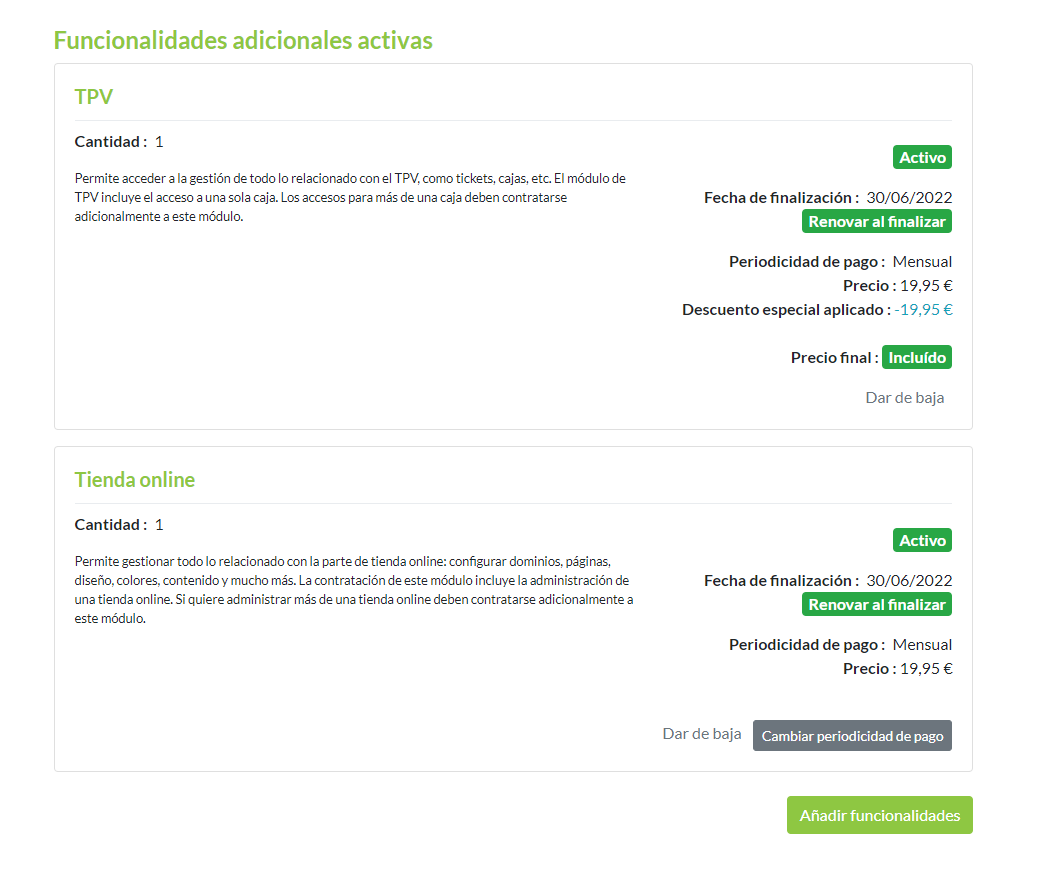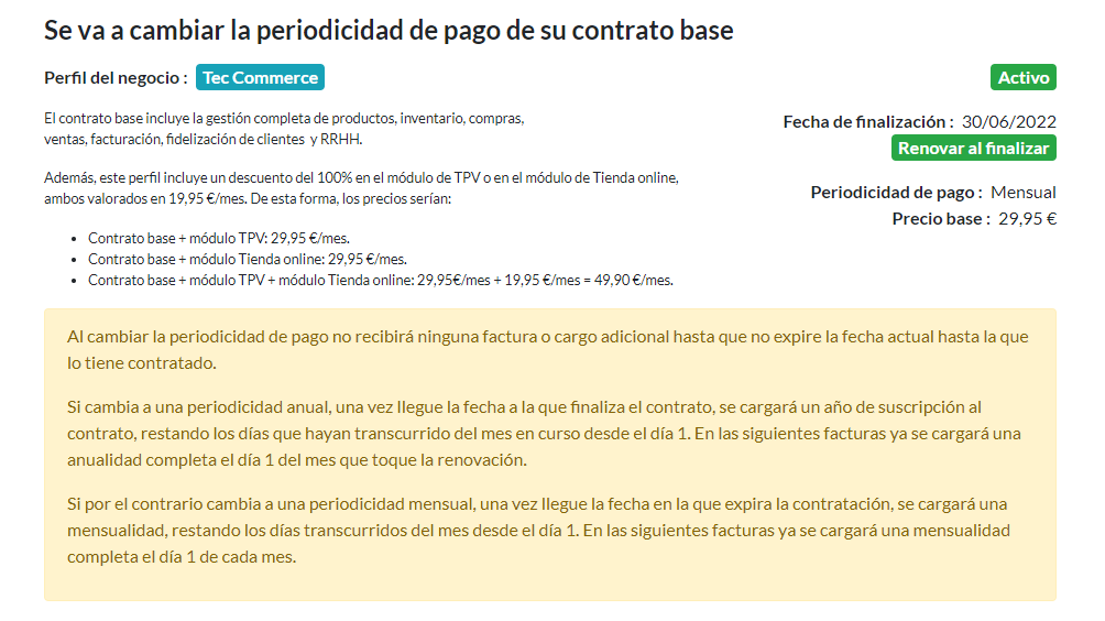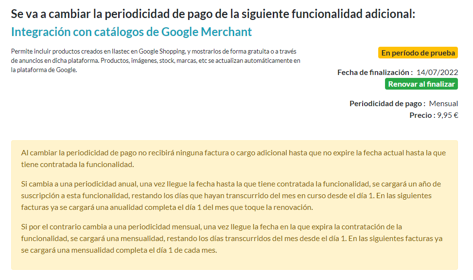 Este cambio no será efectivo de forma inmediata, sino que se tendrá en cuenta para la próxima renovación de la suscripción a la funcionalidad al llegar a la fecha de finalización actual. Al renovarse la suscripción, la periodicidad facturación para esa funcionalidad pasará a la nueva periodicidad indicada.