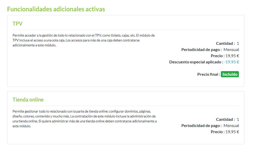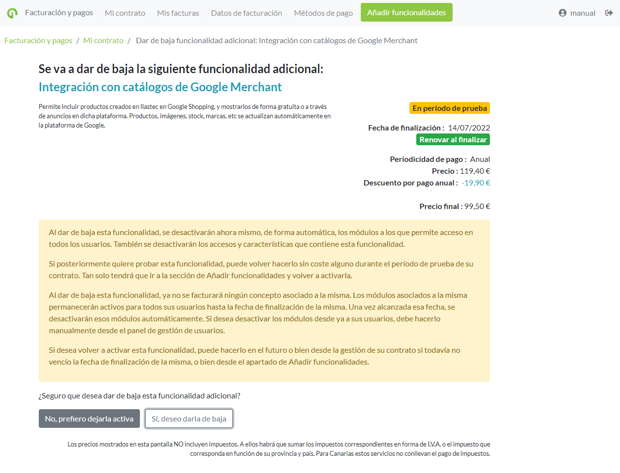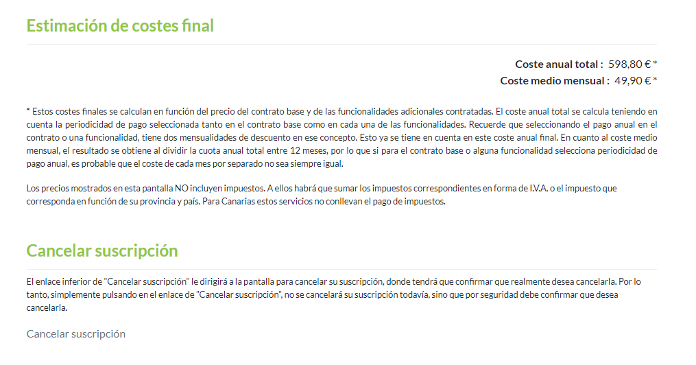 En esta pantalla podrá ver el resumen de la contratación y configuración de esa funcionalidad, y una explicación detallada sobre lo que supone la cancelación.