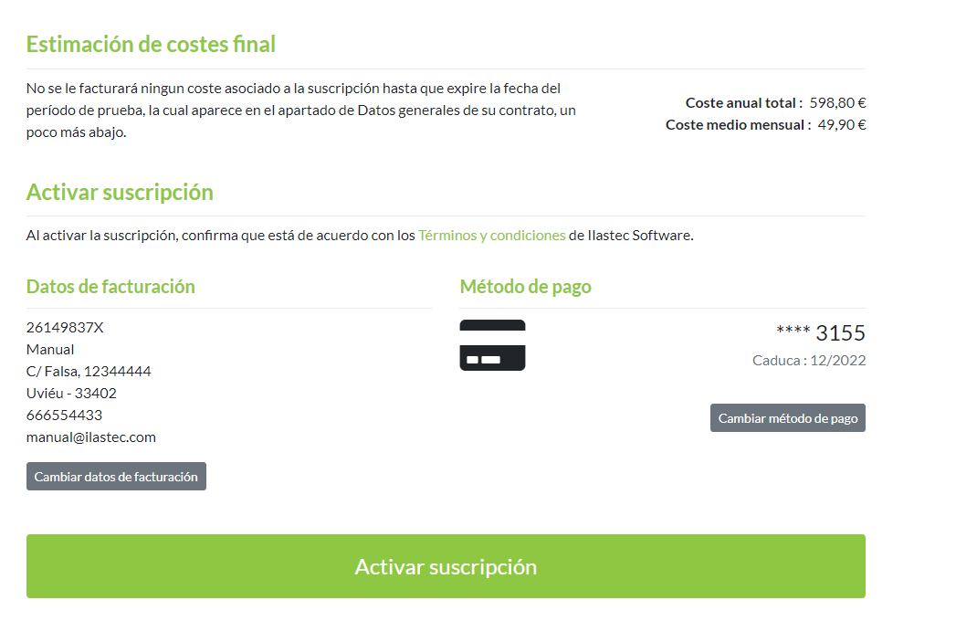 Al crear su cuenta en Ilastec, dispondrá de 30 días para probar el software y resolver todas sus dudas antes de comenzar a trabajar con el programa. Podrá configurar el programa a su gusto, e incluir todas las funcionalidades opcionales que desee probar, sin coste alguno durante el período de prueba y sin introducir ningún dato de pago.