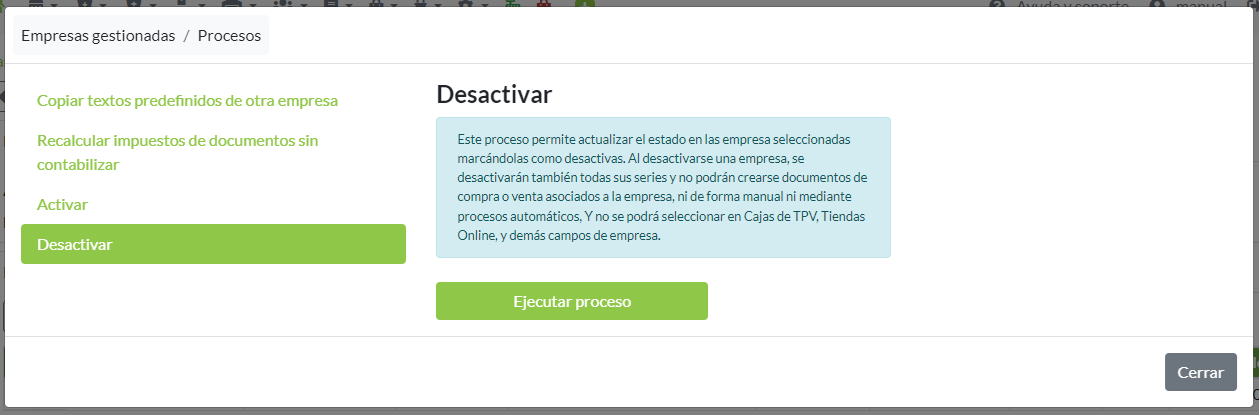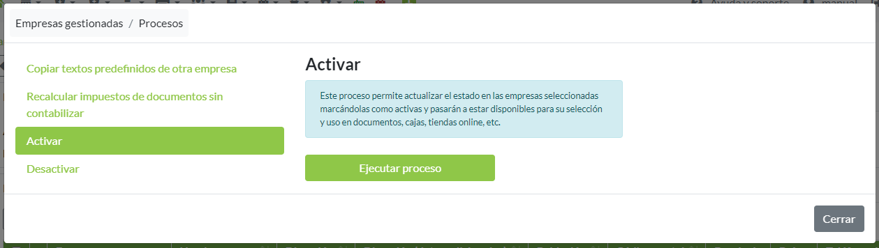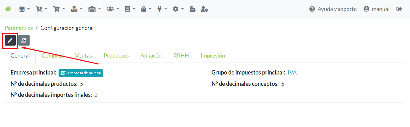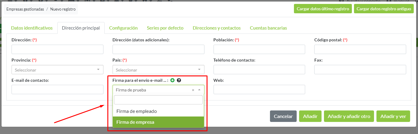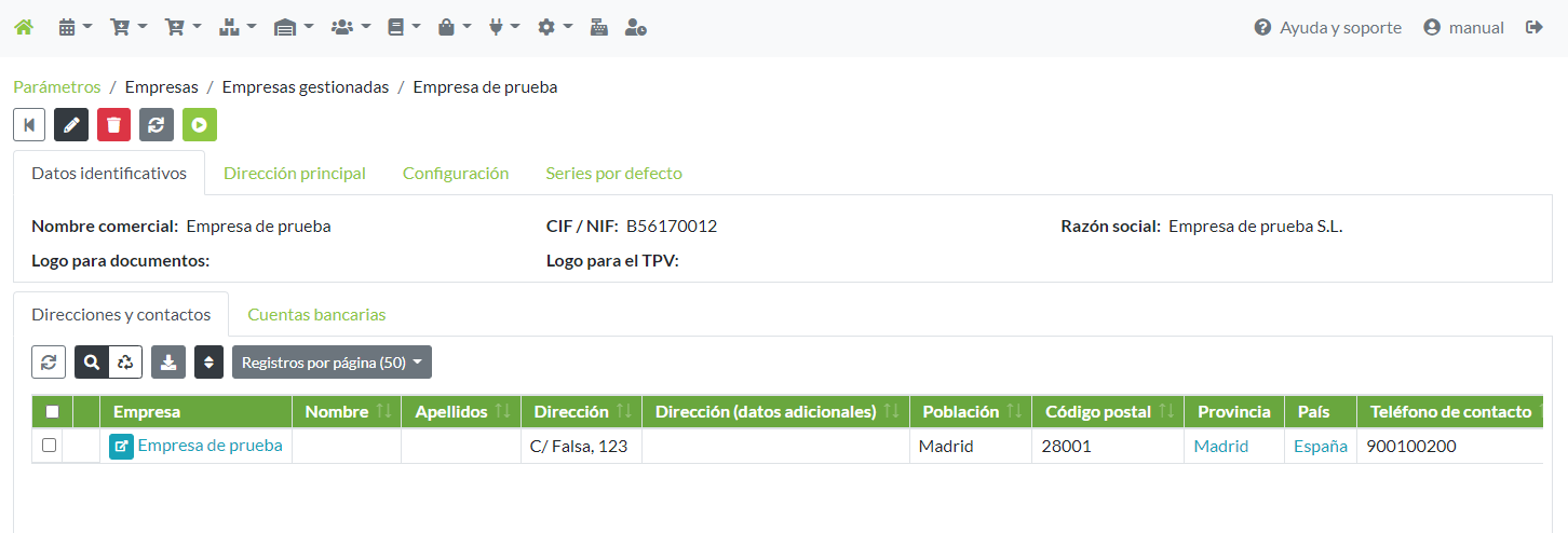 - Empresa principal: Será la empresa que se seleccione por defecto al crear cualquier documento de compra o venta o cualquier otra cosa relacionada con las empresas.