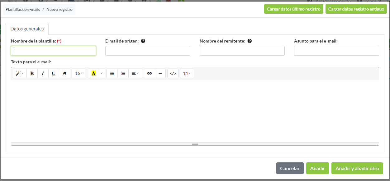 - Añadir: Para crear el nuevo registro y volver al listado de plantillas.