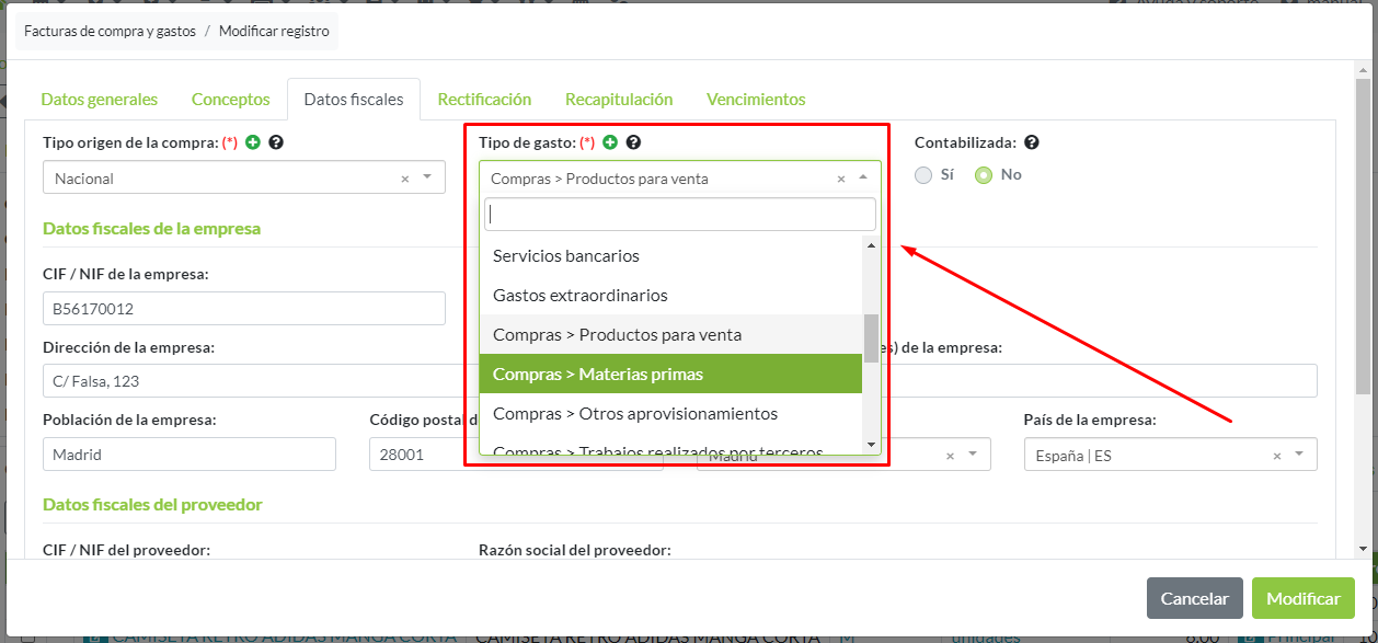 Los registros que se crean en este apartado, estarán disponibles para su selección en el seleccionable Tipo de gasto de la pestaña Datos fiscales de las Facturas de compra que se registran en el programa.