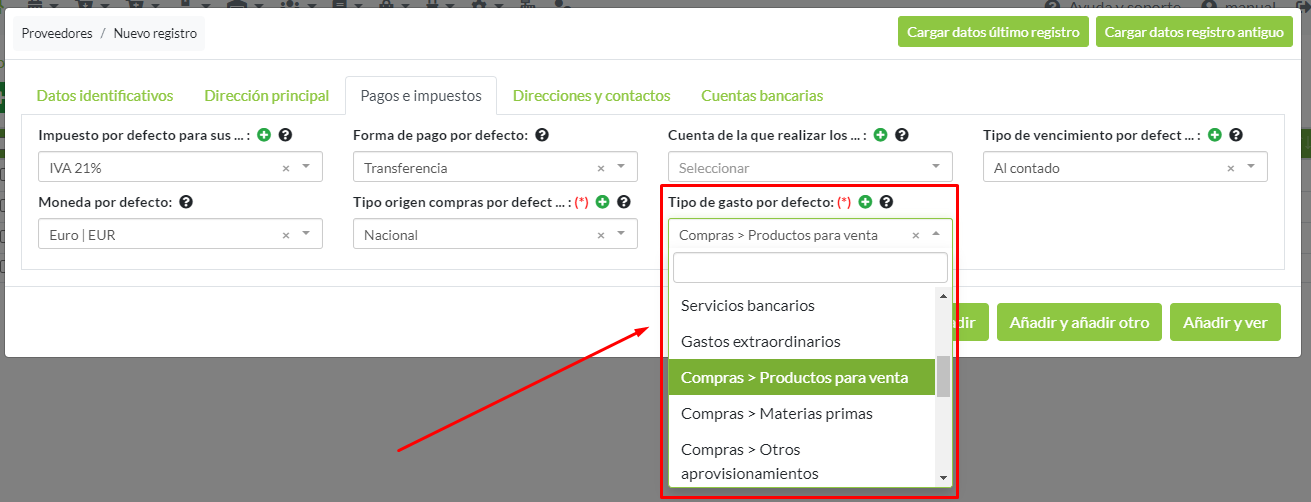 Este campo también se indica de forma automática según el tipo de gasto por defecto indicado en los datos del proveedor.