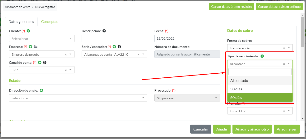 Una vez creado el registro, estará disponible para su selección en el campo Tipo de vencimiento del apartado Datos de pago en los documentos de compra, o Datos de cobro en los documentos de venta.
