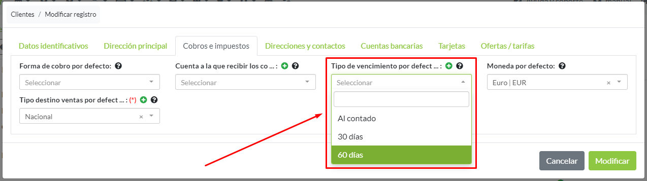 - Tipo de vencimiento: Campo obligatorio para indicar el nombre identificativo del registro.