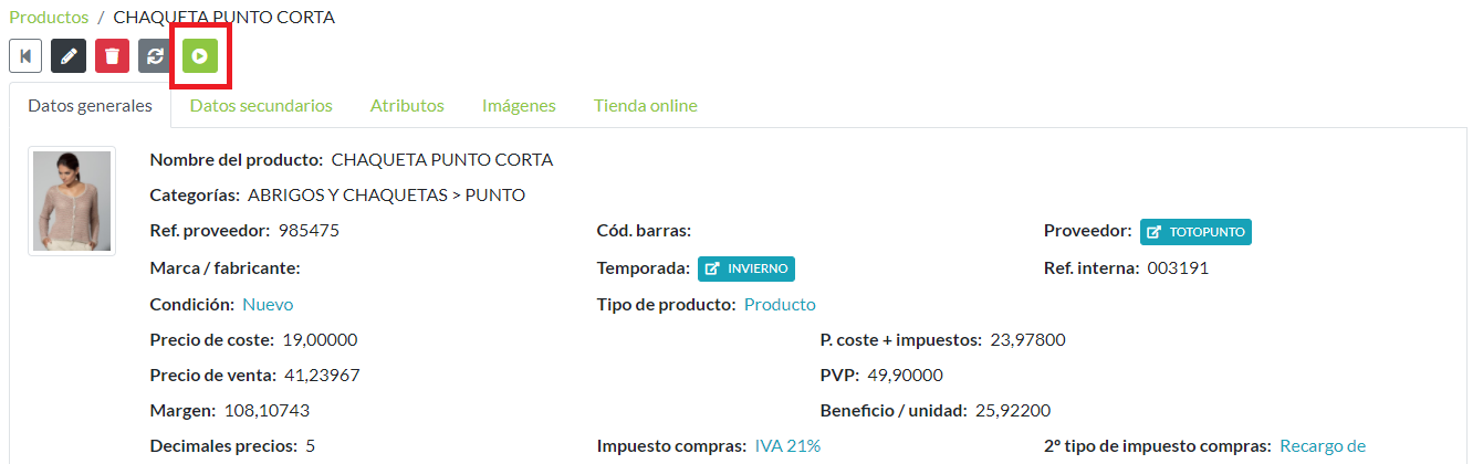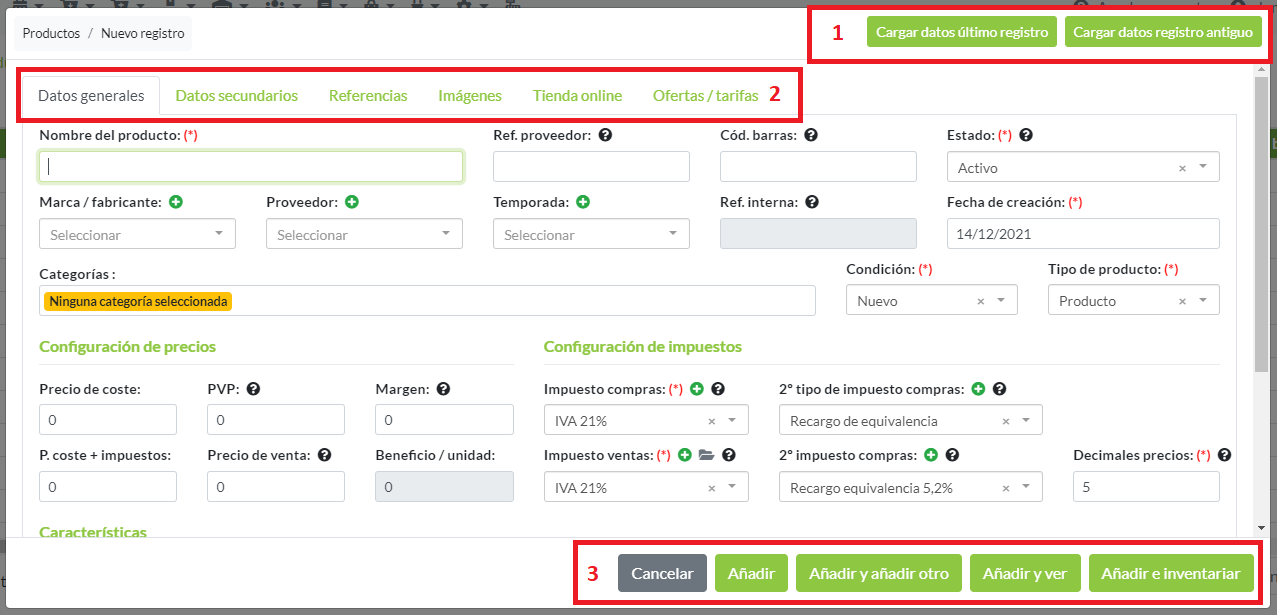 Estos botones son útiles, por ejemplo, si se está creando un producto muy similar al anterior, donde solo habrá que modificar el nombre, referencia y poco más. De esta forma el resto de datos se copiarán automáticamente del producto anteriormente creado.