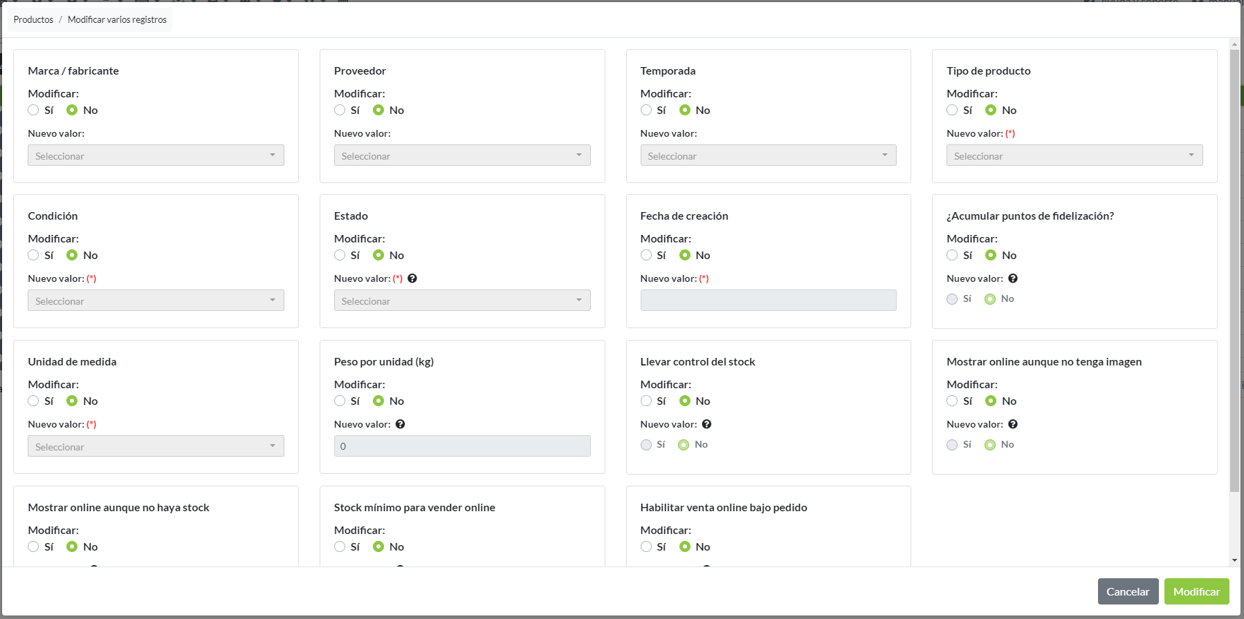 - Botón modificar varios registros, o modificación masiva: Sirve para modificar varios registros a la vez. Previamente será necesario seleccionar cada registro a modificar, utilizando para ello la casilla blanca que aparece a la izquierda en cada fila del listado. Una vez seleccionados varios registros, al pulsar este botón se podrá indicar qué campos se van a modificar y se introducirá el nuevo valor.