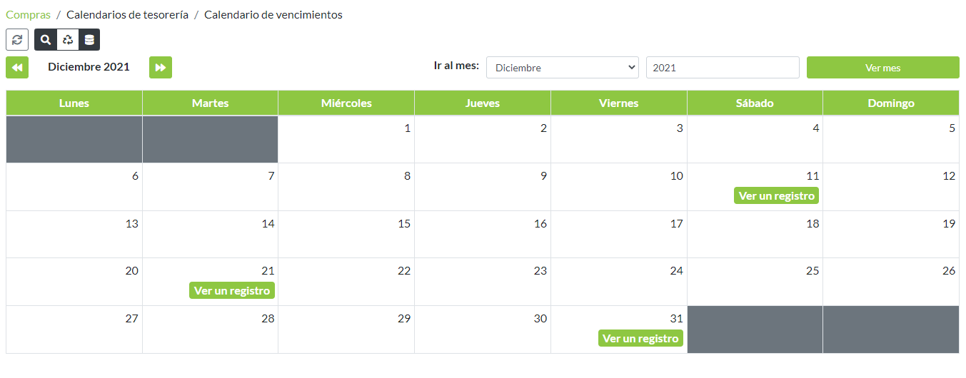 Al igual que en un listado, la pantalla de calendario permite crear nuevos registros, así como hacer búsquedas sobre ellos. Además, se puede navegar hacia adelante y hacia atrás en los meses, o ir a un mes concreto de un año específico.