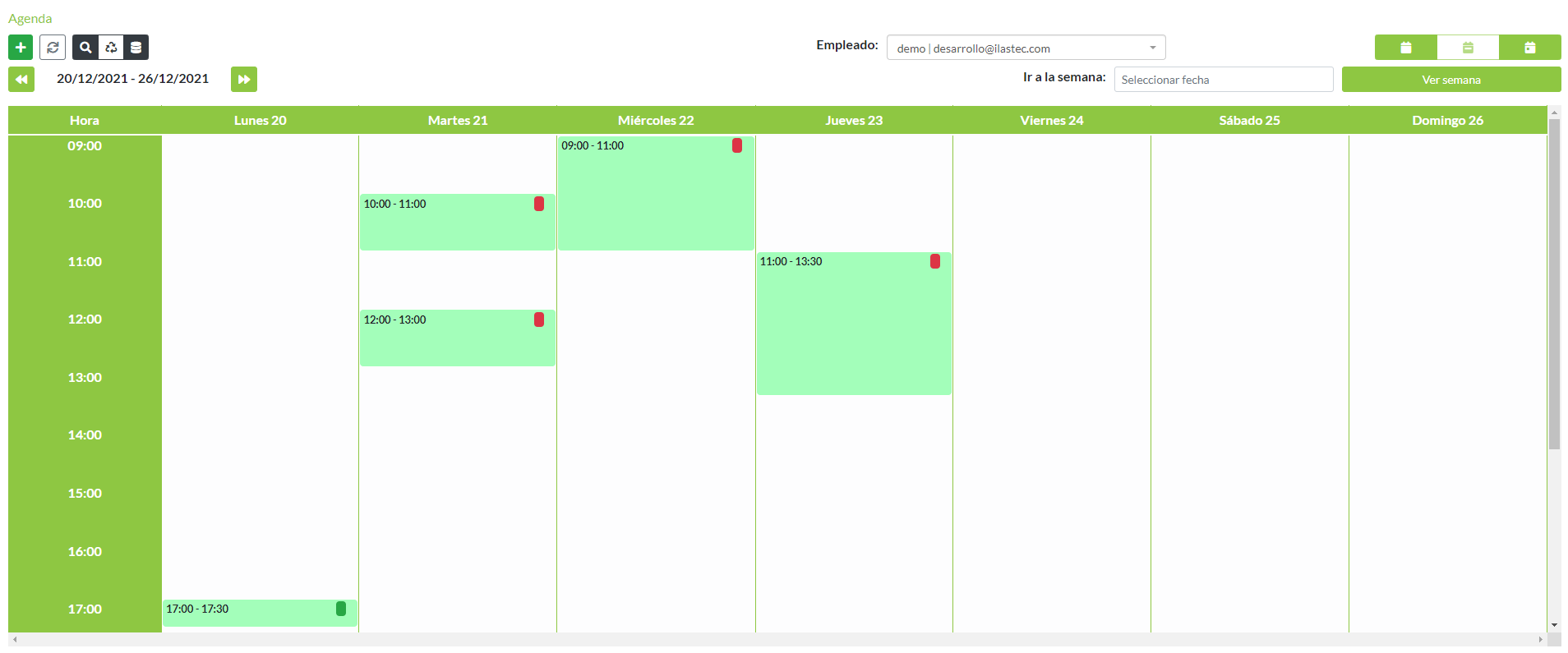 En la parte superior izquierda de la agenda se puede navegar entre semanas, avanzando o retrocediendo en el calendario. Además, algunos calendarios permiten los filtros por empleados asociados a cada evento, con lo que se puede mostrar únicamente el horario de un empleado en concreto.