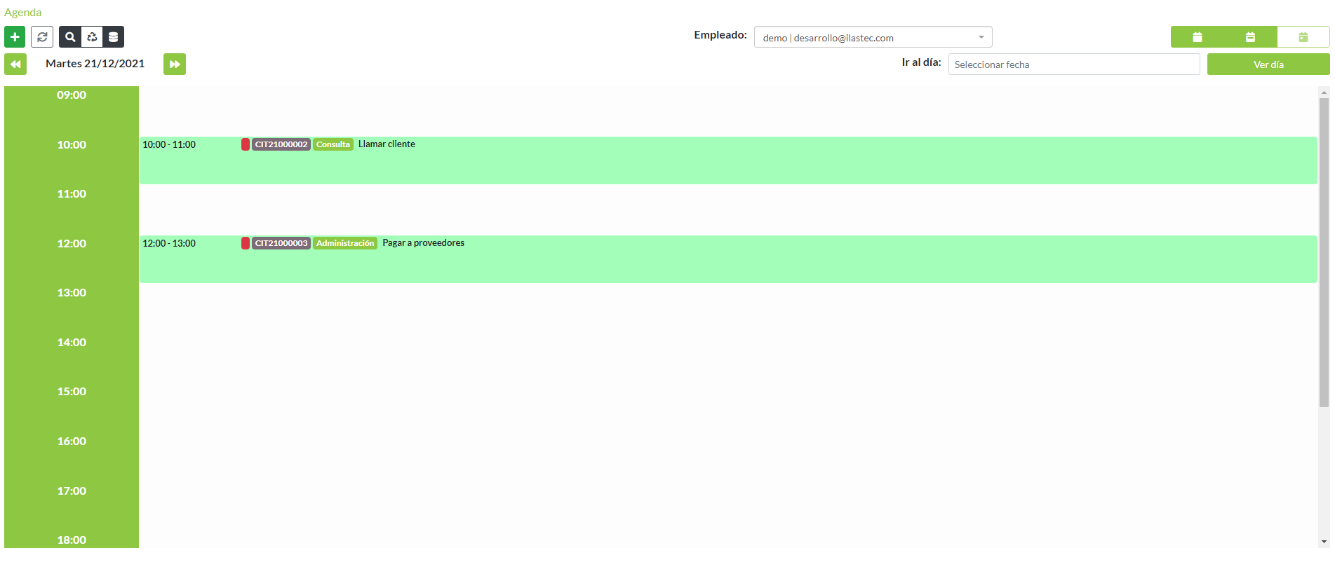 Al igual que en el formato mensual, se puede filtrar por empleado y navegar entre días. Además, en este formato ya se muestra la descripción de cada evento directamente en la pantalla sin necesidad de acceder al mismo.