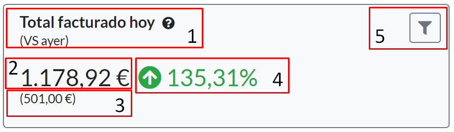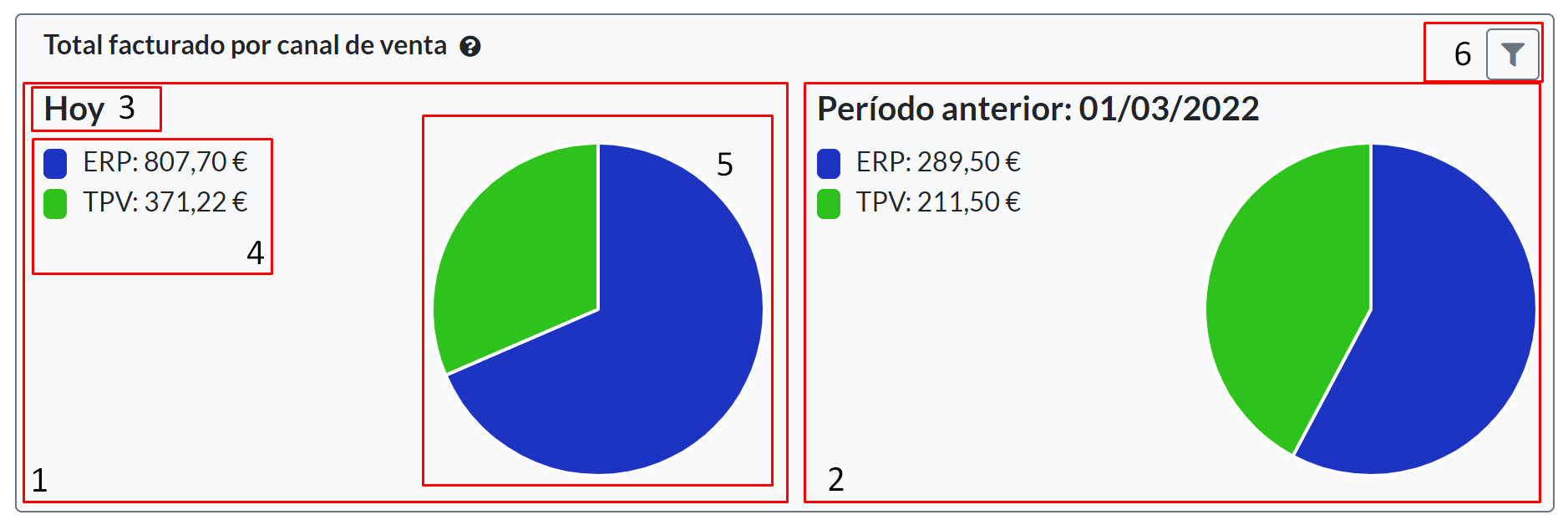 Muestra el total que se ha facturado en todos los canales de venta en la fecha actual, pudiendo filtrar y comparar con un día específico. Por defecto, carga el filtro comparando con los datos del día anterior.