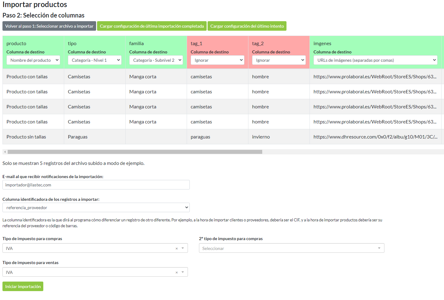 Si ya se ha hecho una importación anteriormente, se puede pulsar el botón "Cargar configuración de última importación", que configurará todas estas columnas automáticamente d ela misma forma que se hizo en la última importación que ha tenido éxito.