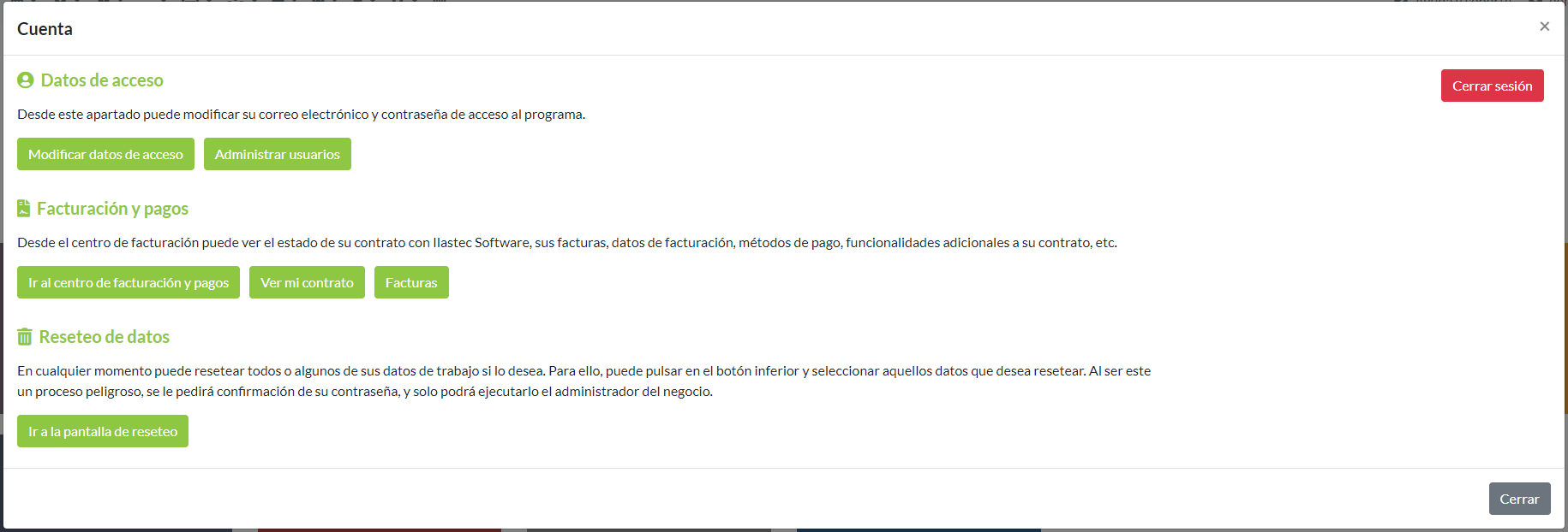 El panel presenta un formato por colores, donde cada color identifica a un módulo en concreto. Pulsando en cualquiera de los módulos se accederá al menú de dicho módulo, permitiendo acceder desde ahí a la pantalla que se desee.