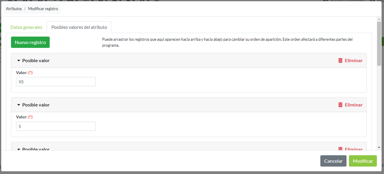 Aquí, modificando por ejemplo el registro de tallas, se pueden añadir posibles valores para estas tallas. Por ejemplo, se podrían añadir las tallas XS, S, M, L y XL. Si se trabaja también con pantalones se puede añadir la 32, 34, 36, 38... etc.