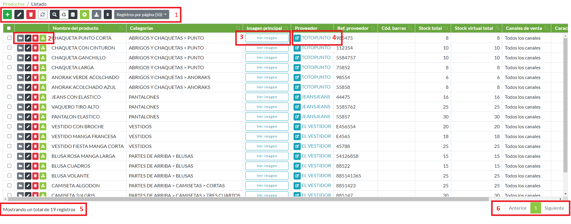 5 - En la parte inferior del listado se indica el número total de registros mostrados y, a la derecha (6), se permite mostrar más páginas del listado (en caso de que las hubiera).