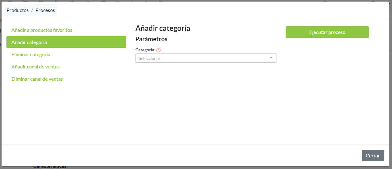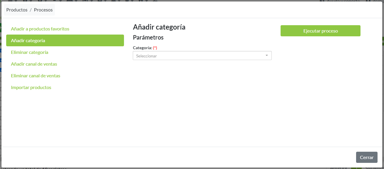 Desde las pantallas de tipo listado, los procesos suelen requerir seleccionar registros para ejecutar una acción sobre todos ellos. Por ejemplo, se pueden seleccionar 10 productos y ejecutar el proceso Añadir categoría, que añadirá esa categoría a todos los productos elegidos.