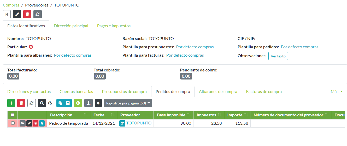 Las fichas de los registros tienen dos secciones bien diferenciadas. Por un lado, en la parte superior se pueden ver los propios datos de ese registro y, en la parte inferior, se muestran todos los listados externos donde aparece el registro consultado. Además, algunos registros pueden tener una sección de totales, como es el caso de los proveedores o los clientes, donde se mostrará el total facturado, por ejemplo.