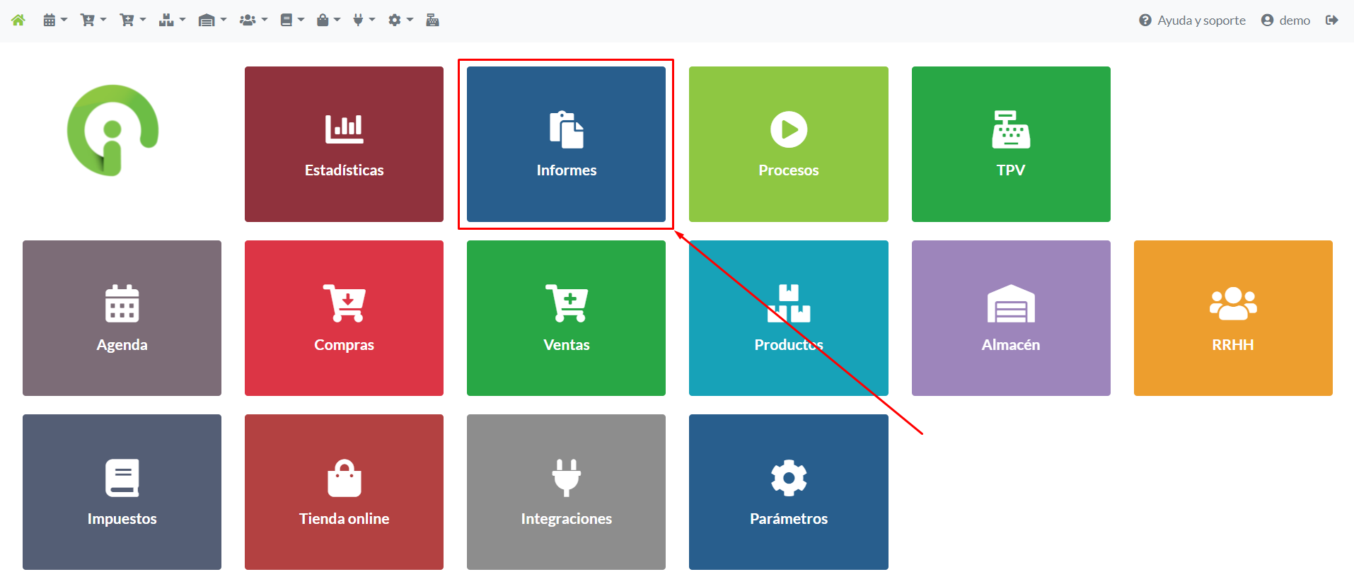 Se pueden encontrar todos los informes generales del sistema desde el módulo de Informes, en la portada del programa.