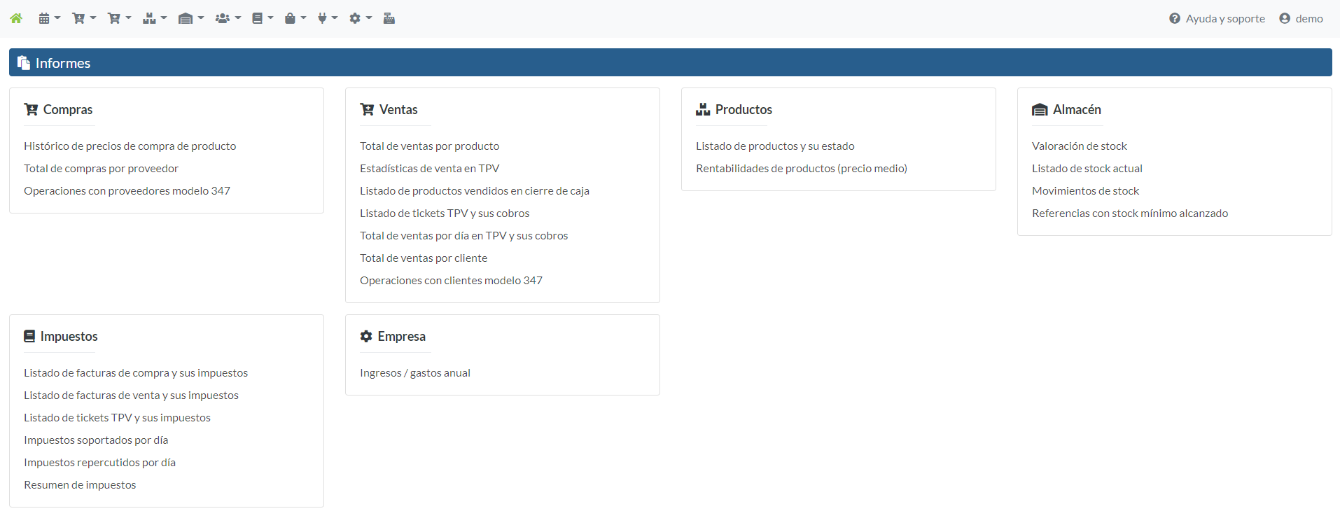 Al acceder a Informes desde la portada se verán los informes divididos por módulos, dependiendo de los permisos de cada usuario.
