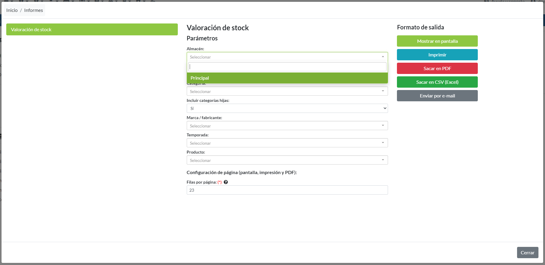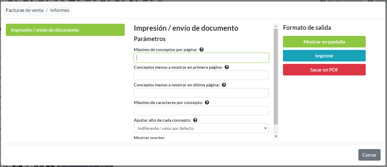 Los informes se pueden abrir en pantalla, imprimir, sacar en formato PDF, exportar a CSV (Excel) o enviar por e-mail.