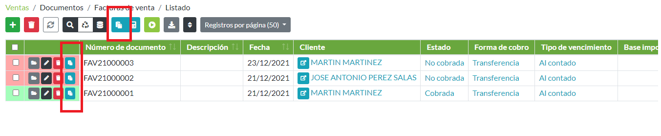 - Botón informes: Aparece en algunos listados, como documentos de compras y ventas. Mostrará los documentos de los registros seleccionados, permitiendo hacer impresiones de varios documentos a la vez.