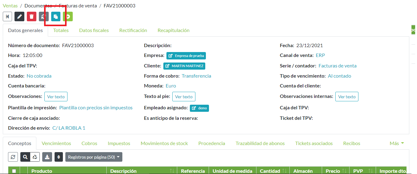 Si se quiere abrir la factura en formato PDF, entonces habrá que hacerlo desde la propia ficha de la factura, tal como se muestra en las siguientes imágenes.
