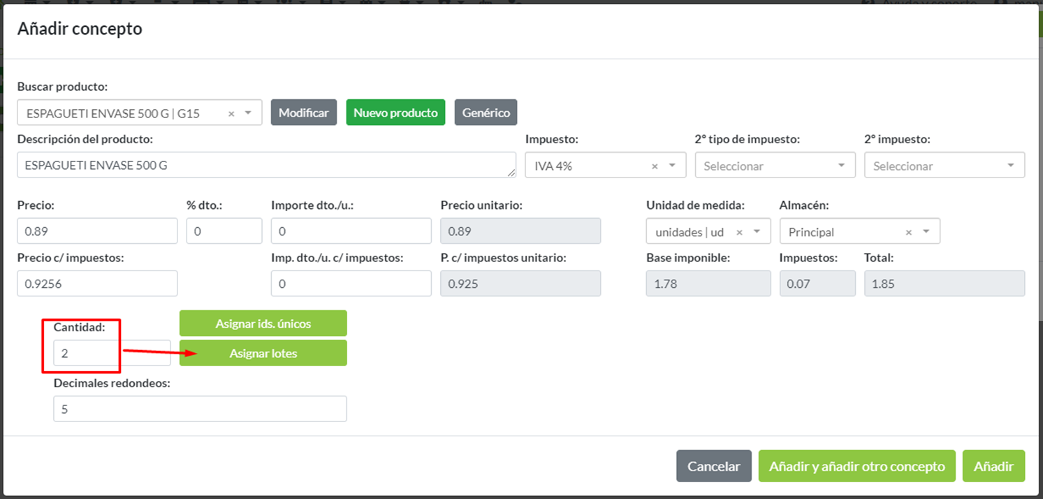 Al añadir el concepto en el documento, se debe indicar la cantidad de productos y pulsar sobre Asignar lotes.
