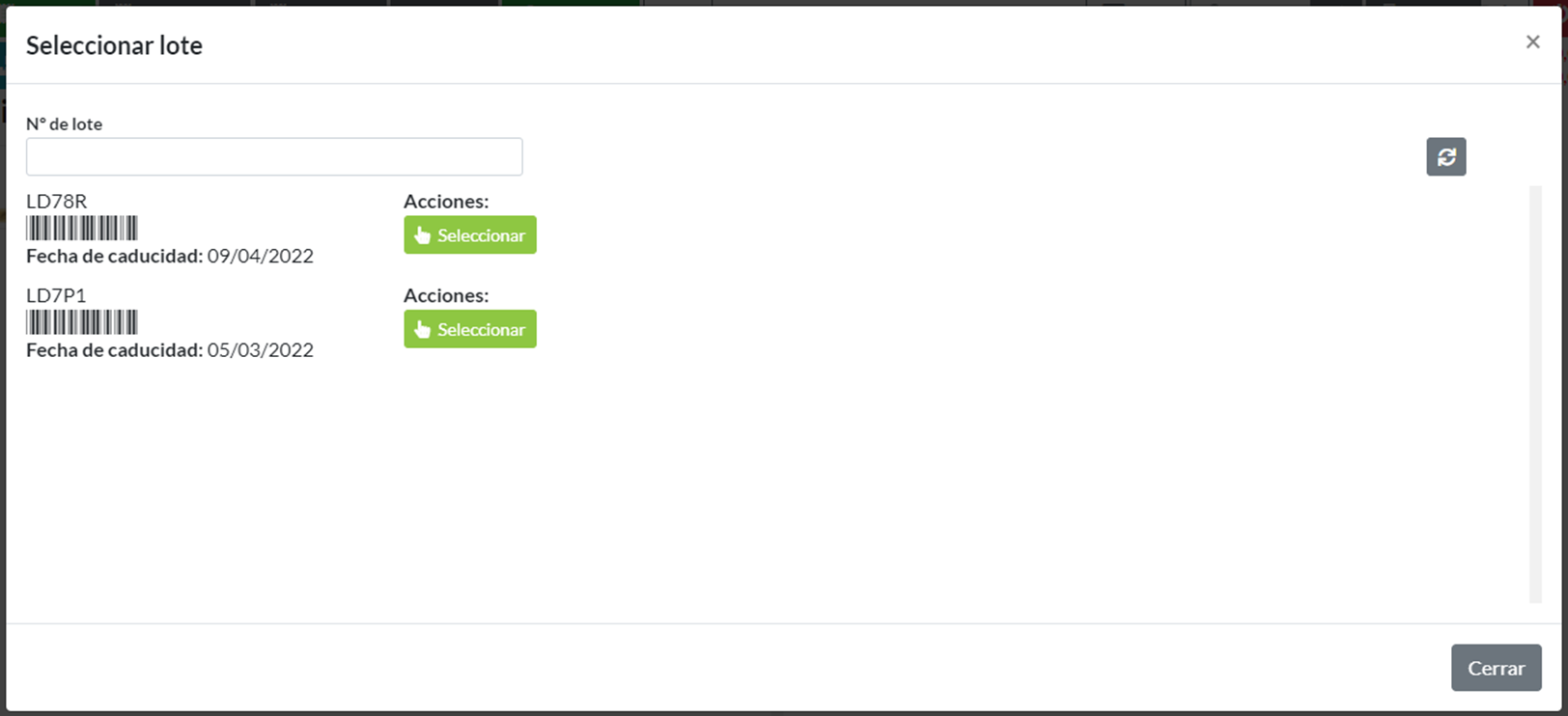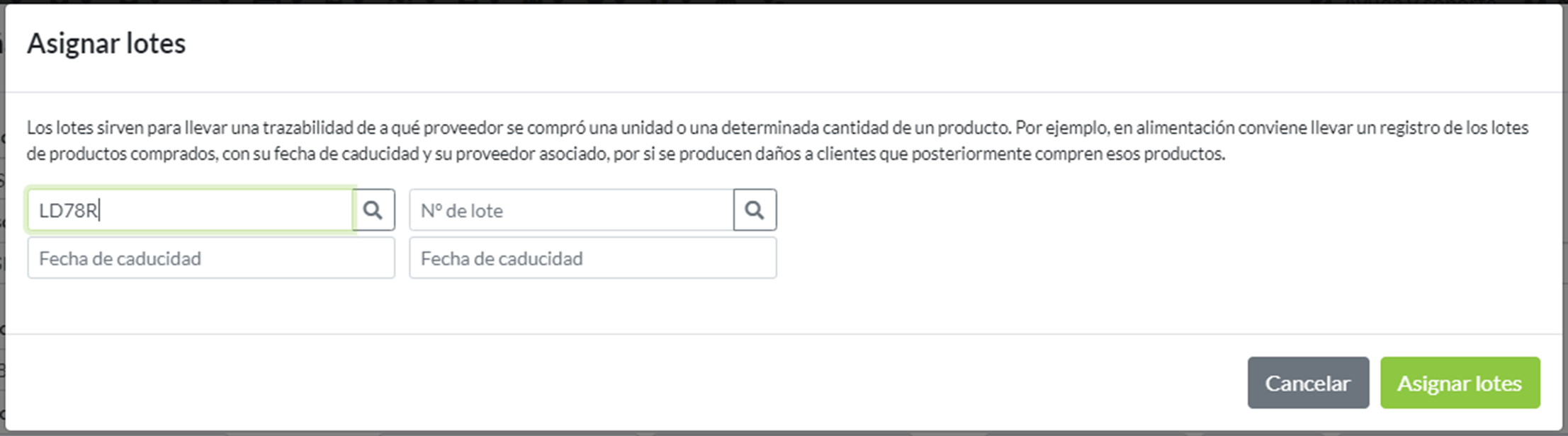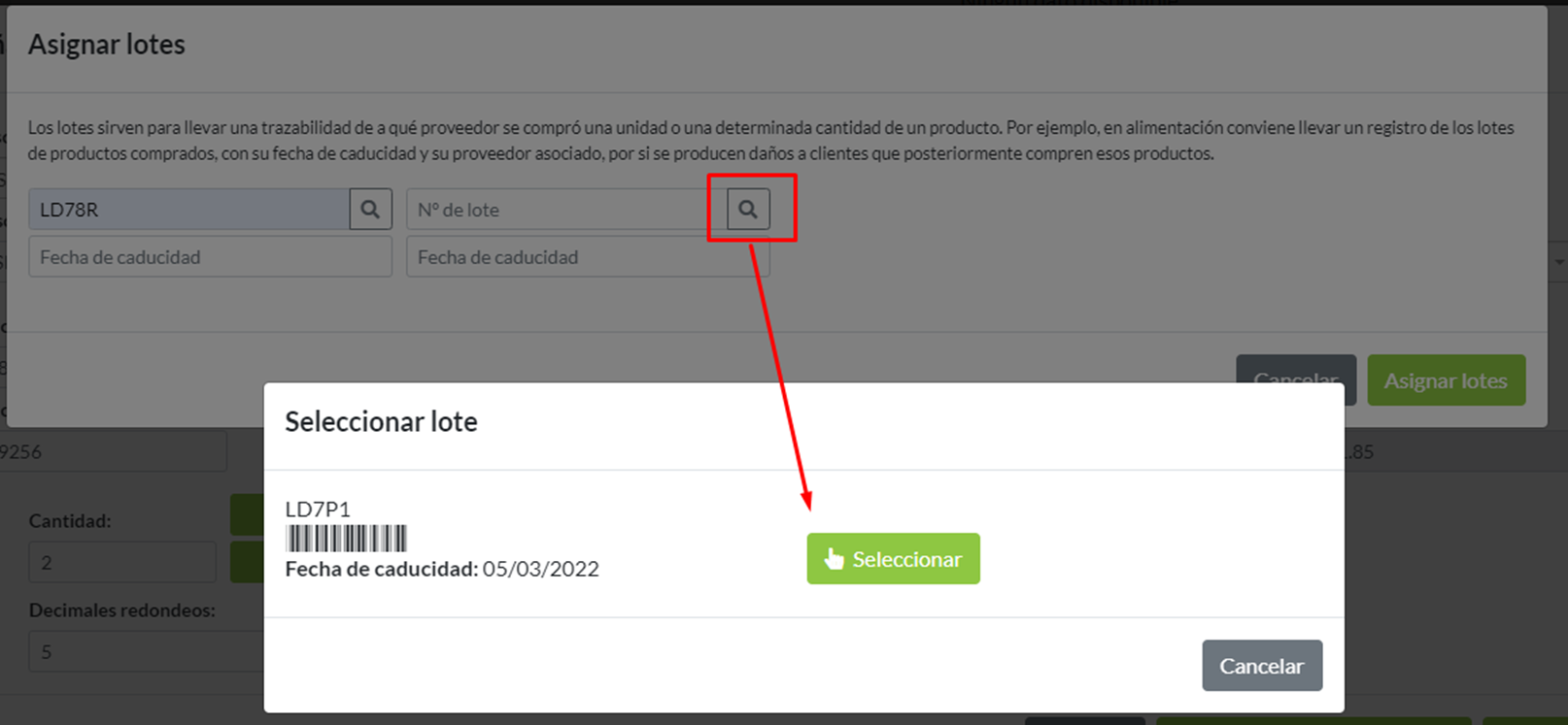 Cada número de lote puede añadirse manualmente, o se puede asignar entre los que ya estén registrados en el sistema pulsando sobre el botón de buscar y seleccionándolo en la lista.