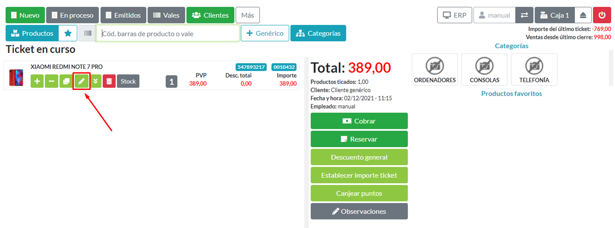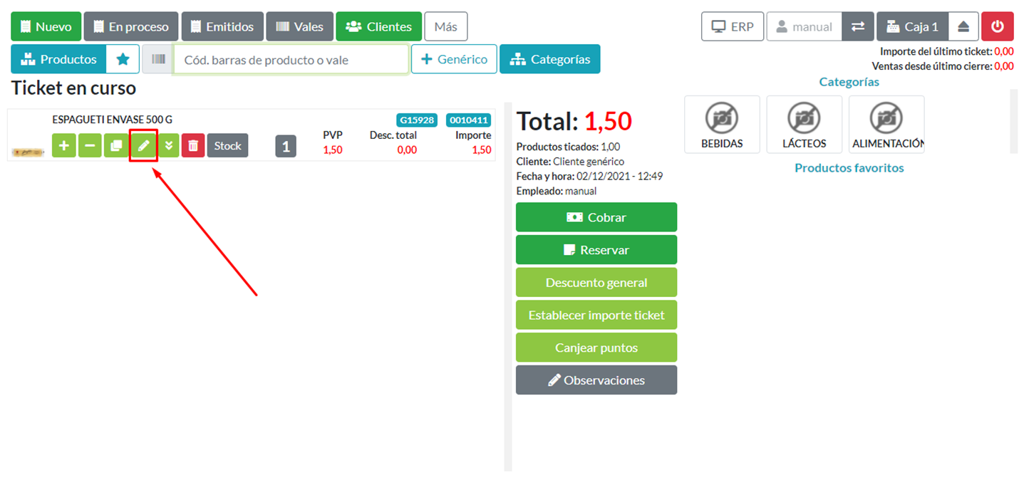 Para asignar el identificador único de un producto en el concepto de un ticket, se debe pulsar sobre el botón de modificar del concepto.