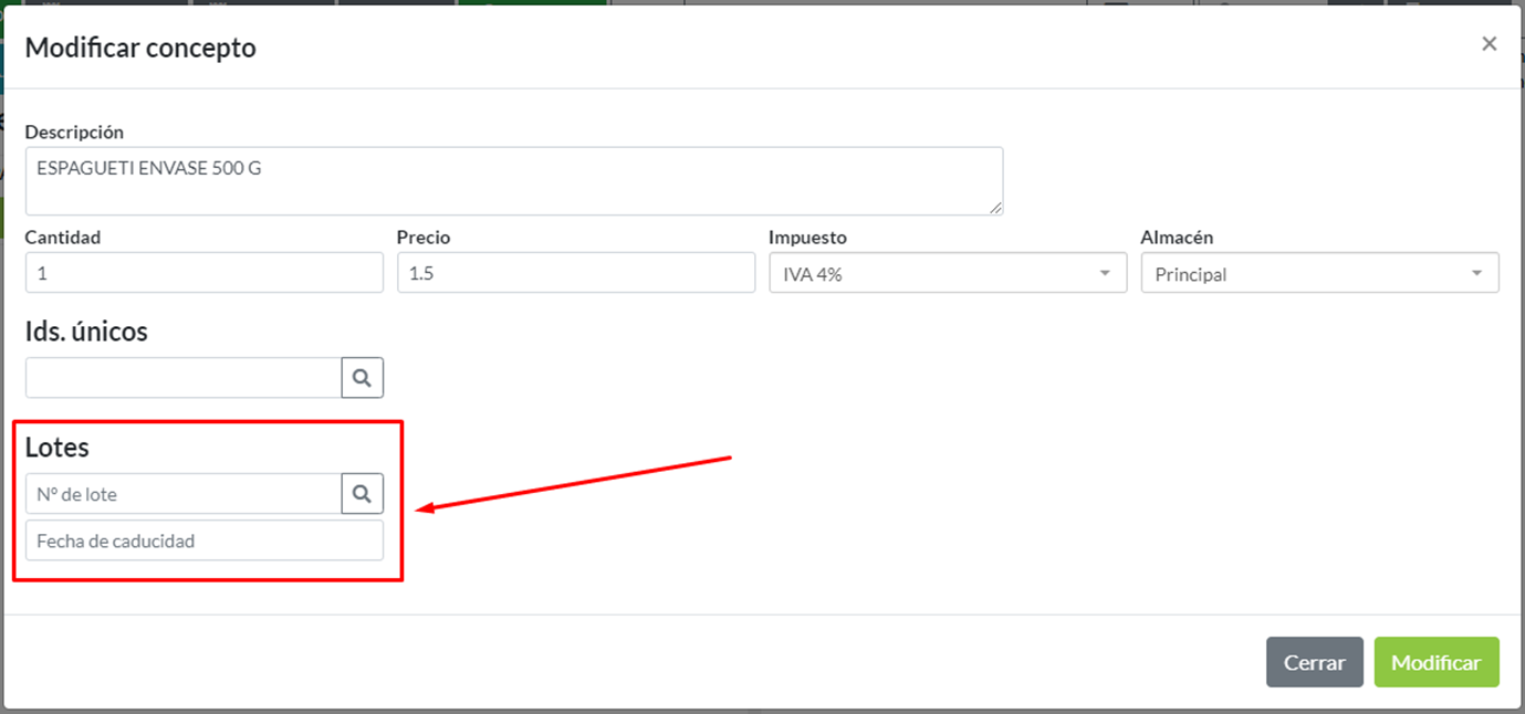 En el menú de modificación del concepto, se debe indicar el identificador en el campo Lotes y la fecha de caducidad, si corresponde.